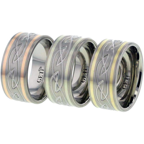Flat profile Titanium ring with machine-cut Celtic knot detail and double 1 mm noble yellow metal inserts.