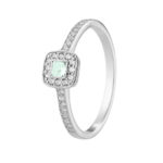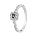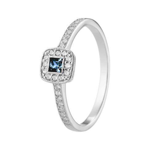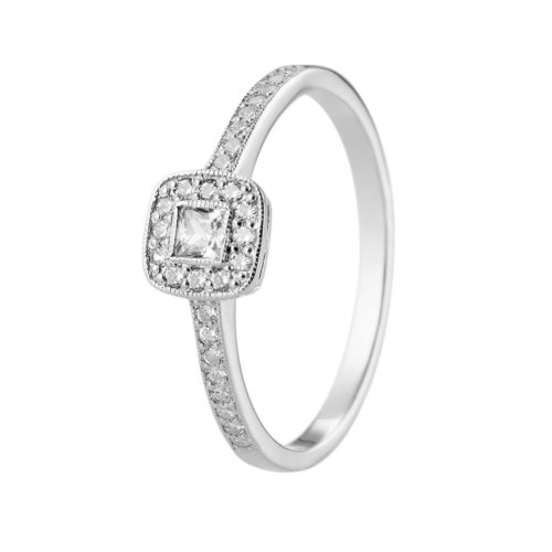 Engagement ring in 18K gold with 29 diamonds. A 0.10ct princess cut diamond in the middle (2.50 mm), 12 brilliant cut diamonds, a total of 0.10ct (1.25mm) and 16 brilliant cut diamonds, a total of 0.12ct (1.0mm)