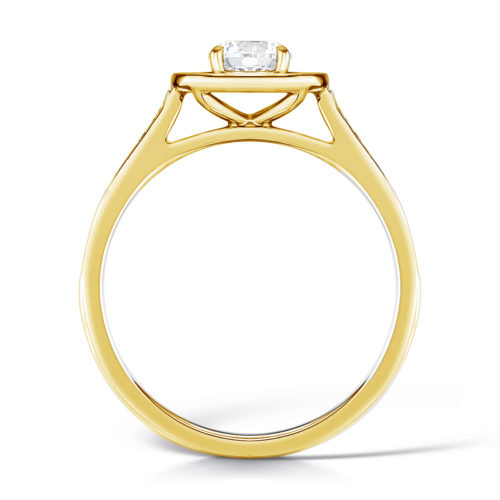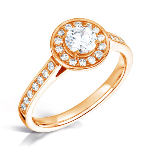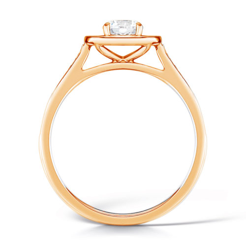 Flower is a very beautiful halo ring in 18K gold with a brilliant-cut 0.75 ct G-vs centre diamond (5.9 mm). The diamond is surrounded by small brilliant-cut G-vs diamonds, which are also mounted on the sides.