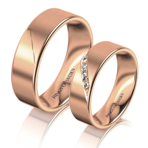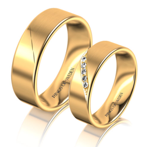 Beautiful flat-court gold rings with slightly rounded edges. A diagonal diamond band distinguishes the ring’s 2 different finishes; polished and lengthwise brushed (matt). The diamond ring is set with 5 pieces of 0.04 ct G-vs brilliant cut diamonds. The rings have been specifically designed to balance a modern and classic feel, for those who like that little extra and where the passion for your love is in focus.