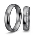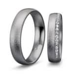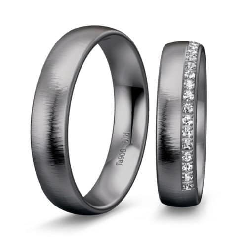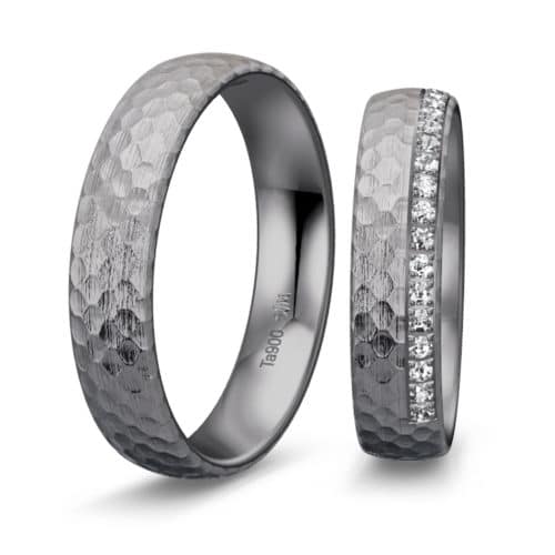 Unity Band, very beautiful rings in tantalum, made with a modern elegance and robustness. The women’s ring is adorned with a band of 17 brilliant cut diamonds, totalling 0.170 carats, whose discreet setting is designed to create a subtle yet stunning shine that complements the ring’s sophisticated industrial look. The rings are available in five different finishes. Choose from classic polished for a traditional and polished finish; brushed matte crosswise for a modern and textured feel; brushed matte lengthwise to emphasise the lines of the ring; coarse-sanded for a distinctive and robust look; or spherical matte for hammered texture. Each finish contributes to the exclusive character of the rings and offers a personalised expression of the wearer’s taste.