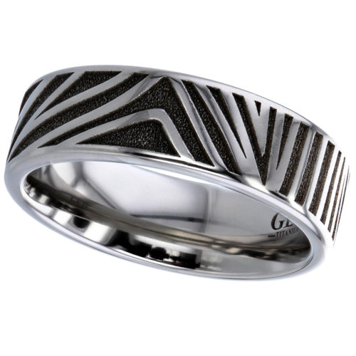 Cylinderformad titanring med lasergravering som ser ut som Damascus.