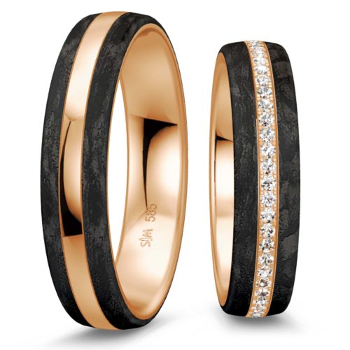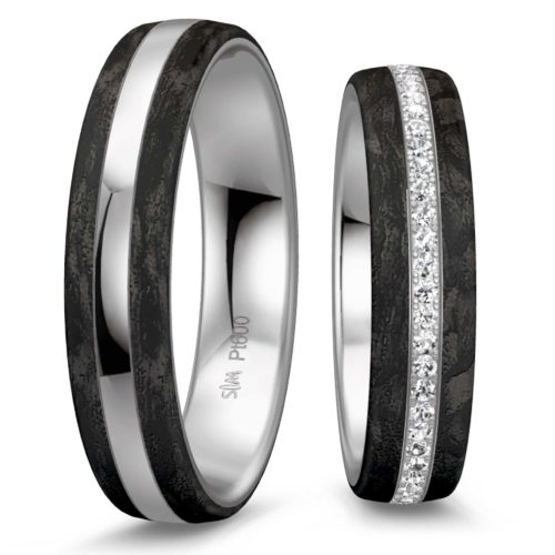 Otroligt vackra kolfiberringar i kombination med 14K guld eller 950 Platina. Diamantringen är infattad med ett band av 55 stycken briljantslipade diamanter, totalt 0.303 ct G-vs. Carbon Diamond Strip är en glänsande kombination av svart kolfiber, elegant guld och skimrande diamanter. Mycket lyxiga ringar som kommer vara enbetydlig symbol för er kärlek.