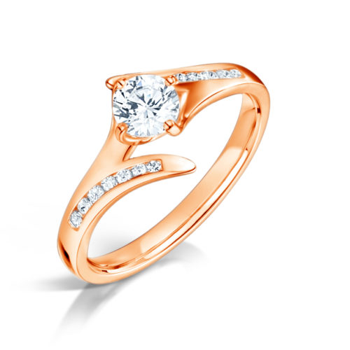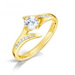 Curious är en vacker lekfull sidostensring i 18K guld med en briljantslipad 0.40ct G-vs diamant som huvudsten (4.8mm). Sidorna är infattade med briljantslipade G-vs diamanter i olika storlekar på varje sida.