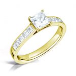 Limelight är en ståtlig sidostensring i 18K guld med en princesslipad 0.50ct G-vs diamant som huvudsten (4.4mm). Sidorna är infattade med 5 stycken princesslipade G-vs diamanter på varje sida.