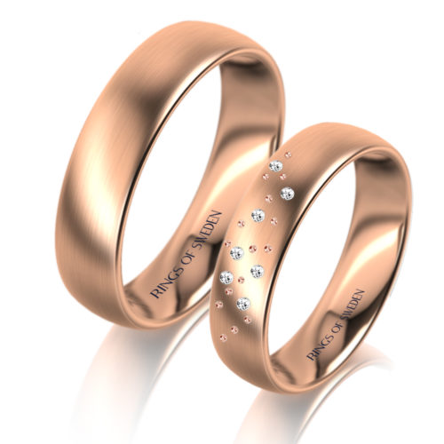 Mycket vackra halvkupade 18 karat guldringar med borstad (matt) finish. Diamantringen är infattad med 7 briljantslipade 0.03 ct G-vs diamanter. Låt denna stjärnhimmel av diamanter och glimrande utsmyckningar representera de oförglömliga stunderna i ert förhållande.