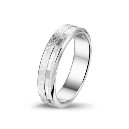 Vacker ring i 925 sterlingsilver med häftig isig ytbehandling och dekorativt spår. Vitguldsrhodinerad för extra hållbar och vit yta.